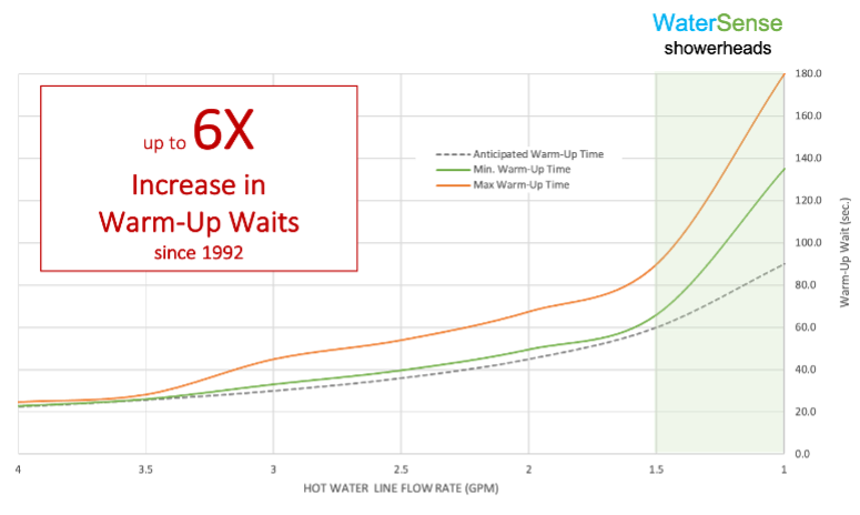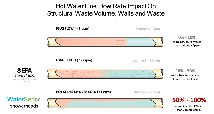 Research presented by John Koeller in Evaluation of Potential Best Management Practices -Residential Hot Water Distribution,indicates the impact on hot water waits imposed by lower flow rate showerheads is exponential, not linear due to these increased thermal losses. As a result, flow rates of 1 gpm or less on the hot water line,a common occurrence with WaterSense rated shower heads, increases the volume of Structural Waste that must be purged before hot water arrives. The effect is a50% to 100% increase in the actual volume of Structural Waste that must be removed. In other words, bathers now have to remove more non-bathing temperature water than the volume of water residing in the hot water line. The thermal losses of slow-moving hot water create an incremental volume of lukewarm water (Structural Waste) that must also be removed before bathing temperature water arrives. The result? In many cases today’s hot water waits (Warm-Up Waits) are up to 6X longer than they were in the early 90’s, and the only thing that changed in the home was the installation of water and energy efficient showerheads.