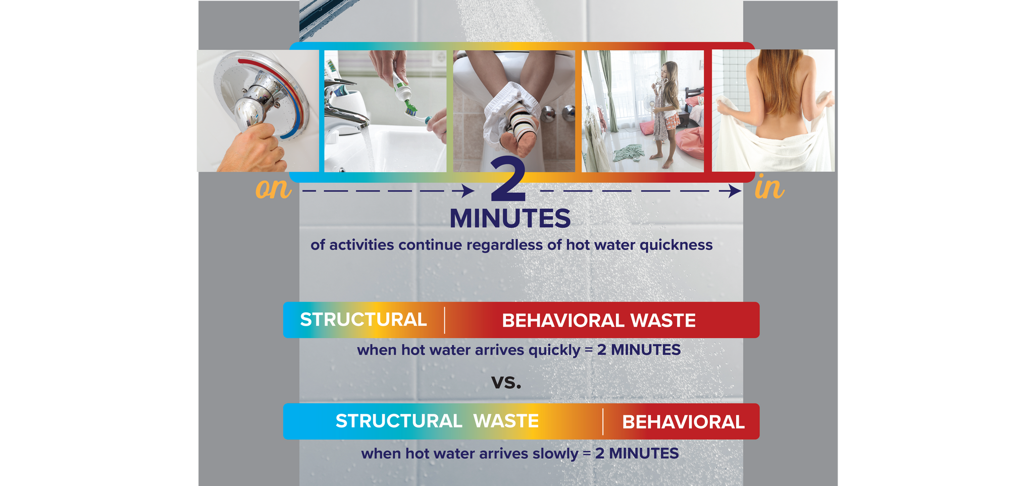 It doesn't take much of a hot water wait (Structural Waste) to stimulate the human behavior resulting in the development of a Warm-Up Routine and its corresponding Warm-Up Waste. Lawrence Berkeley National Lab field data presented in Disaggregating Residential Shower Warm-Up Waste indicates that hot water waits as little as 20 seconds encourage bathers to turn-in the shower and then leave to do something else while waiting for hot water to arrive.